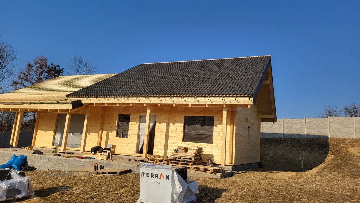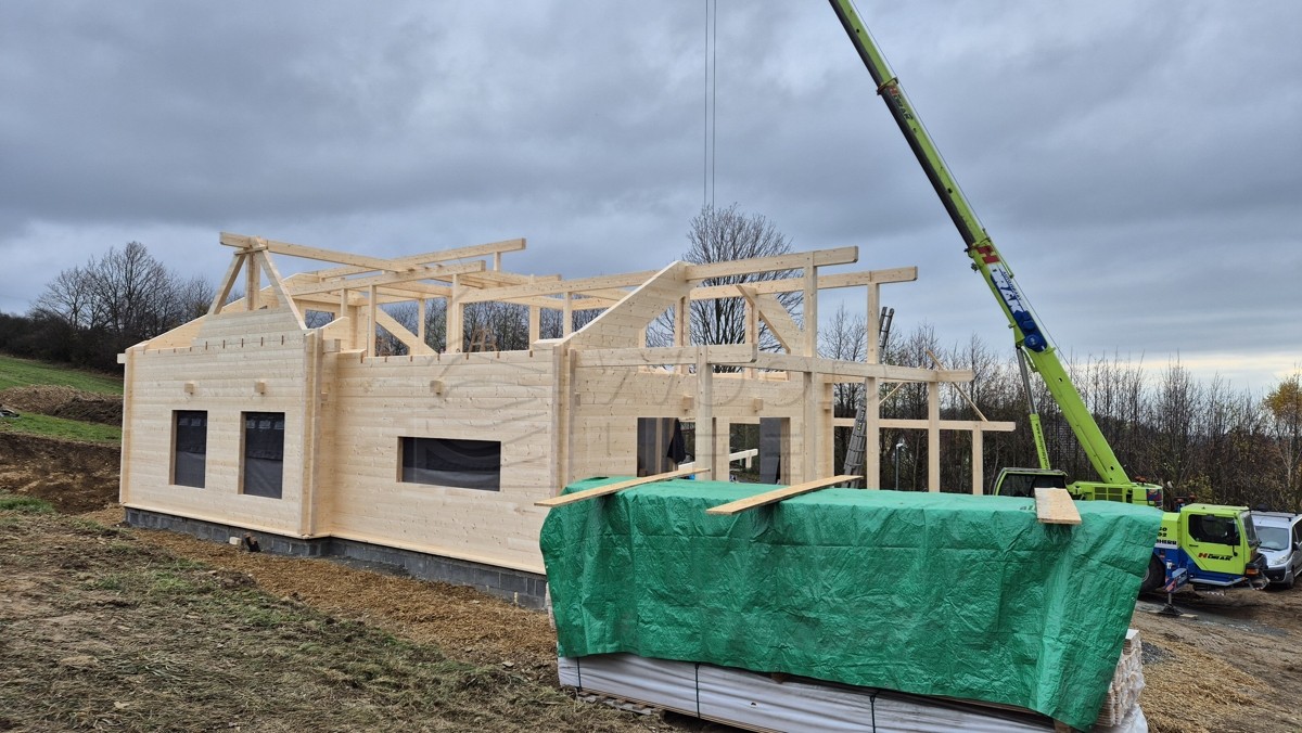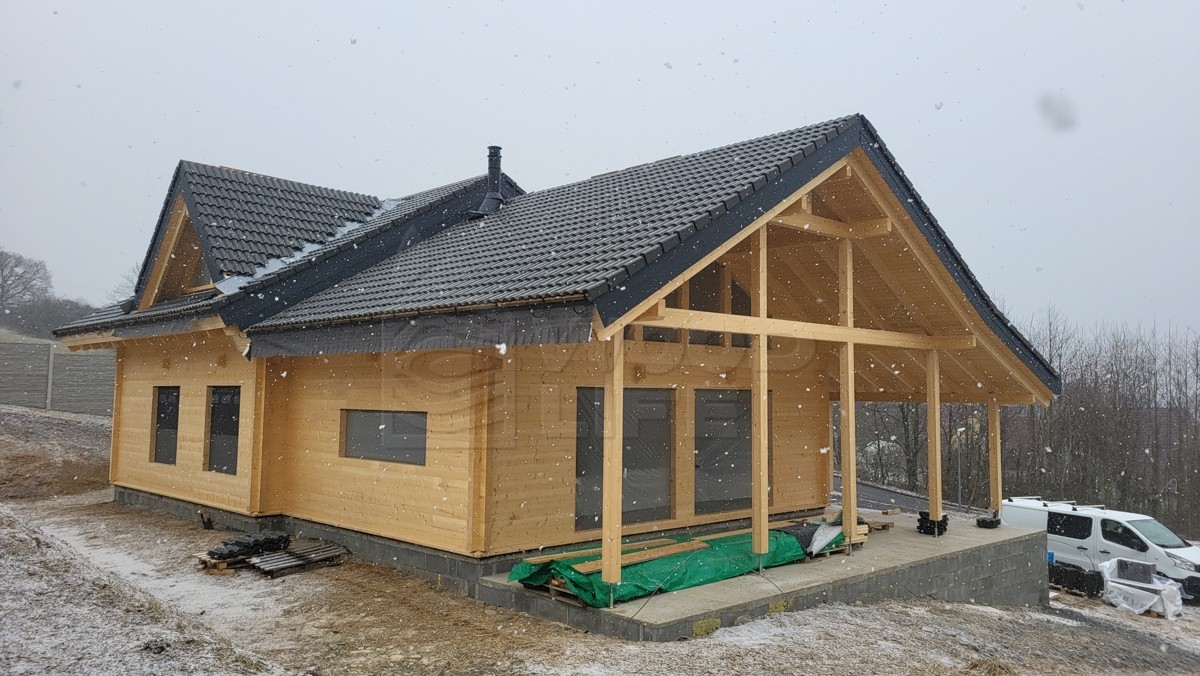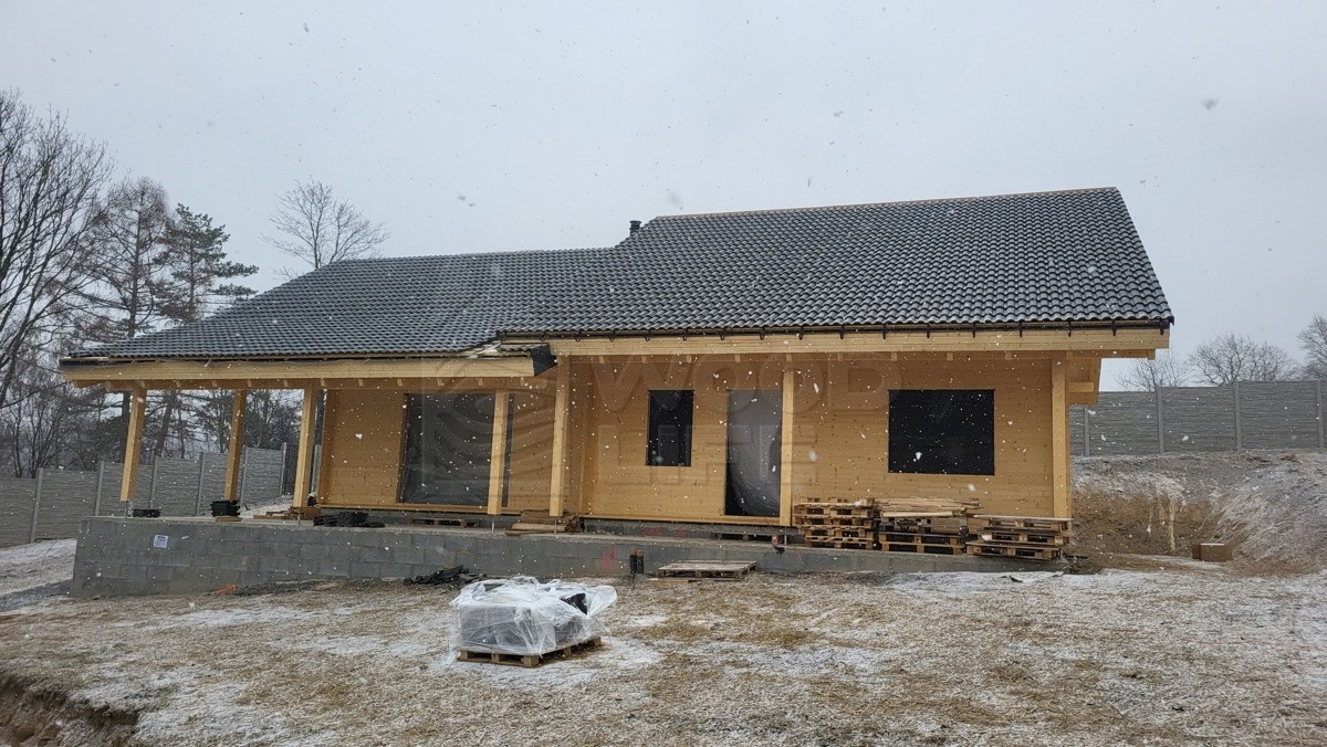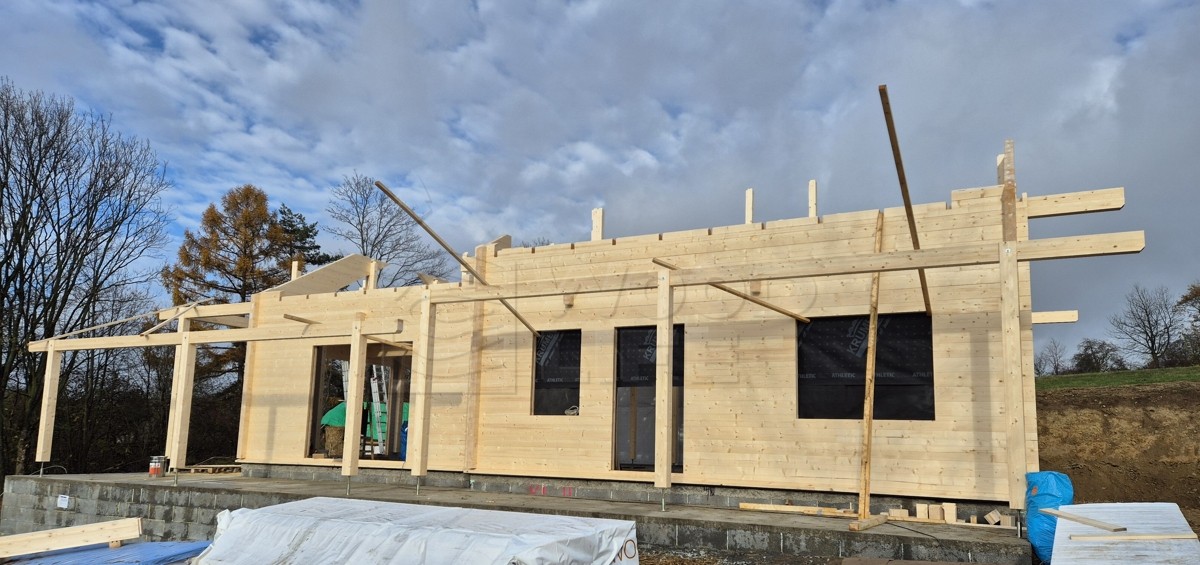 Podkrovní srubový dům SLUNEČNÁ se realizuje v Olomouckém kraji. Srub je postavený na kopci, na konci vesnice s krásným výhledem do okolní krajiny. Srubový dům má část nad kuchyní a obývacím pokojem otevřený do střechy s pohledovými krovy a druhá část srubu je podkroví. Na srub navazuje velká zastřešená terasa ve tvaru písmene L.